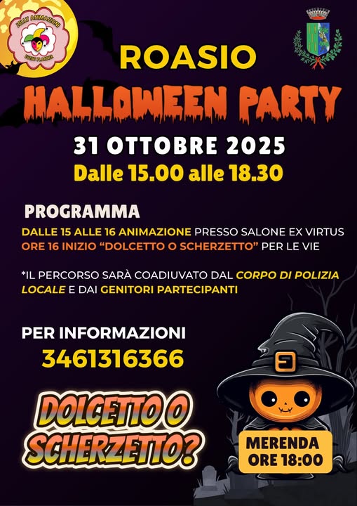 A Roasio torna anche quest’anno la grande festa di Halloween, un pomeriggio di giochi, musica e dolcetti pensato per i più piccoli e per le famiglie. L’appuntamento è fissato per venerdì 31 ottobre 2025, dalle 15.00 alle 18.30, con un programma ricco e coinvolgente.