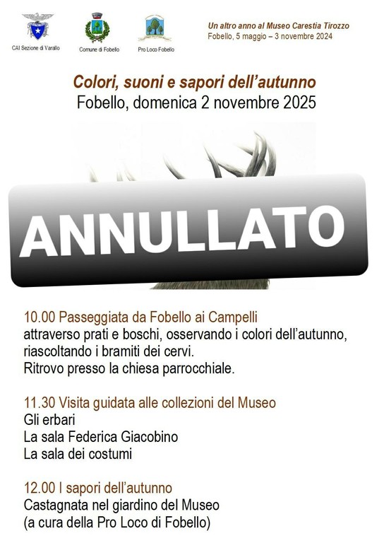 Causa maltempo, è stato annullato l’atteso appuntamento “Colori, suoni e sapori dell’autunno”, previsto per domenica 2 novembre 2025 a Fobello. L’evento, organizzato dal CAI sezione di Varallo, dal Comune di Fobello e dalla Pro Loco, avrebbe dovuto concludere la stagione di attività legate al Museo Carestia Tirozzo, offrendo una giornata all’insegna della natura, delle tradizioni e dei sapori locali.