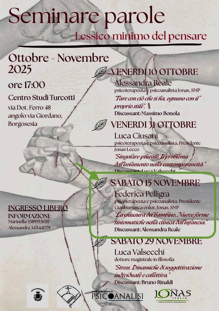 Prosegue il ciclo culturale “Seminare parole – Lessico minimo del pensare”, la rassegna dedicata all’approfondimento psicologico e filosofico promossa al Centro Studi Turcotti di Borgosesia. Sabato 15 novembre 2025, alle 17, l’appuntamento sarà con la psicoterapeuta e psicoanalista Federica Pelligra, presidente dell’Associazione Jonas SMP.