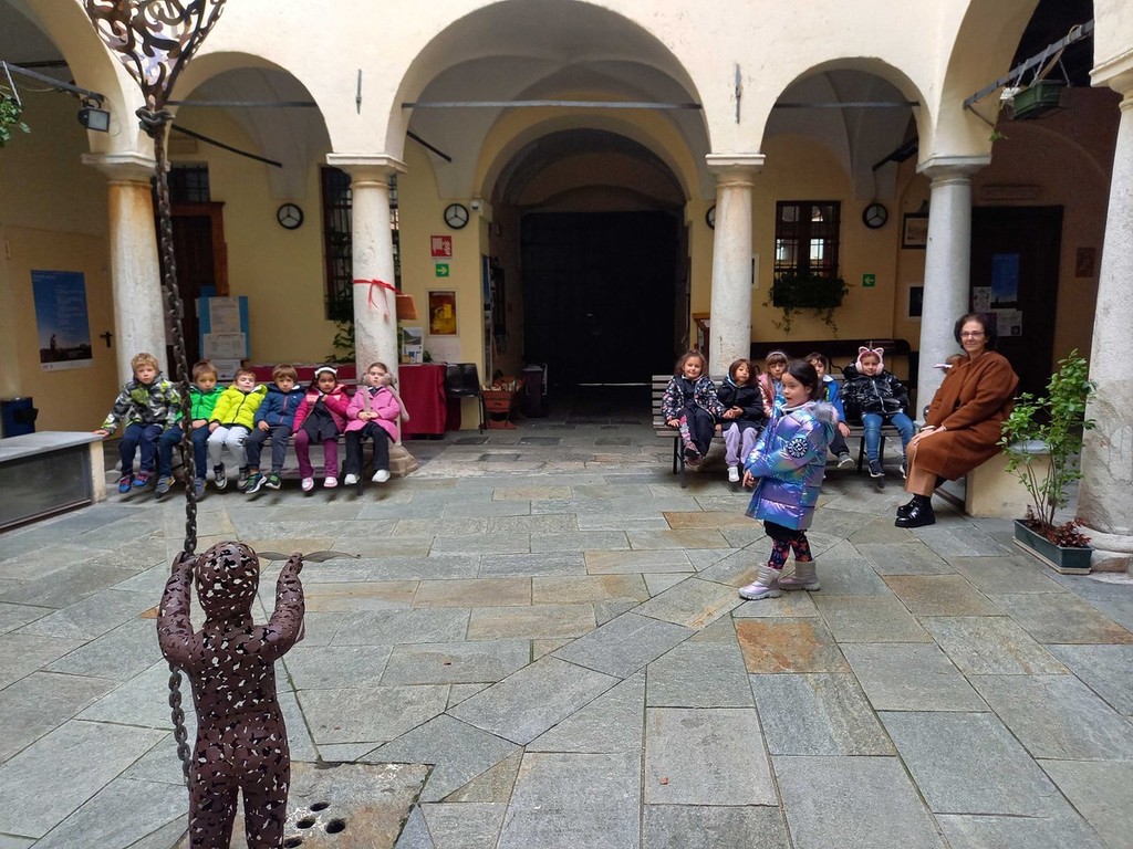Le due classi prime dell’Istituto Comprensivo di Varallo, accompagnate dalle Insegnanti Antonella Tosi, Nunzia Macariello, Stella Digena e Sara Scriccia, venerdì 14 novembre si sono recate in Biblioteca in occasione di: “#Io leggo perché”, l’iniziativa nazionale nata per arricchire le Biblioteche scolastiche, che coinvolgeva le librerie dove potevano essere acquistati libri da donare alle scuole. Si è parlato delle diverse possibilità di lettura, visitando anche la mostra di fotografie di Roberto Cerri: “La Natura in Bianco e Nero. A passo lento sul confine tra Luce e Ombra”, che ha particolarmente interessato i bambini, oggi non più abituati a vedere le fotografie stampate e ad apprezzare l’essenzialità del bianco e nero, ma le foglie hanno fatto miracoli, stimolando osservazioni e riflessioni. Si è poi passati alle letture in Ludoteca e alla lettura braille e tattile, utilizzando i numerosi volumi particolari acquistati con il contributo del Lions Club Valsesia. Accomiatandosi in cortile l’opera di Ruben Bertoldo: “La conoscenza rende liberi”, ha offerto un ulteriore suggerimento per rinforzare il concetto dell’importanza della lettura.