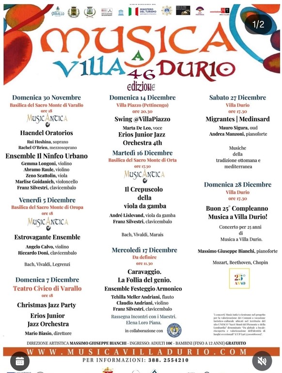 La tradizionale rassegna “Musica a Villa Durio” torna anche quest’anno con la sua 46ª edizione, proponendo un calendario ricco di concerti che coinvolgeranno Varallo, Pettinengo e il Sacro Monte di Orta. Il programma, diffuso dagli organizzatori, attraversa diversi linguaggi musicali: dalla musica antica al jazz, fino alle sonorità mediterranee, con appuntamenti distribuiti dal 30 novembre al 28 dicembre 2025.