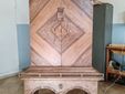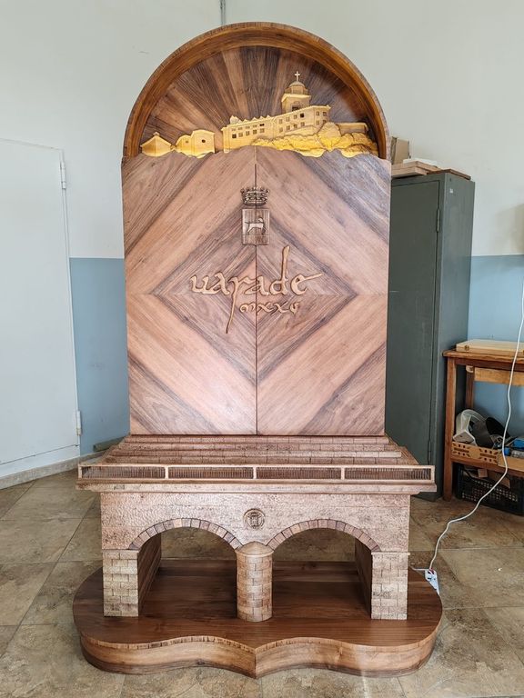 Nella parte superiore, un armadio a due ante che si apre come un abbraccio, conducendo a una lunetta scolpita a mano raffigurante lo skyline del Sacro Monte. All’interno, le ante ospitano formelle in rilievo che narrano i momenti più importanti della storia cittadina.