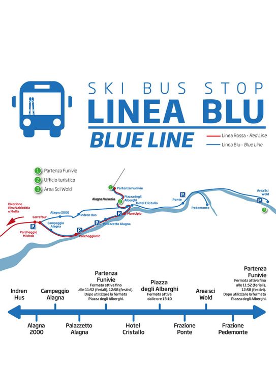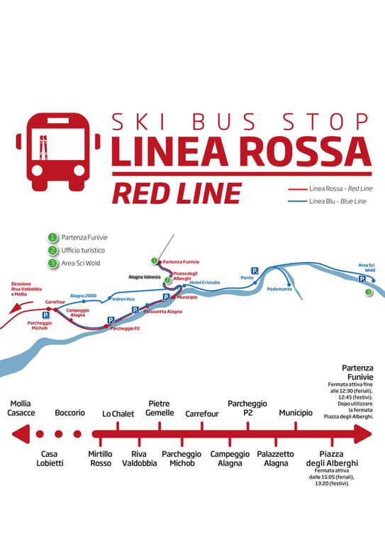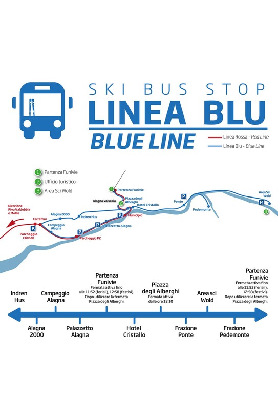 Rispetto alla passata stagione, cambia la gestione della fermata Piazzale Funivie, attiva solo al mattino; nel pomeriggio la fermata di riferimento diventa Piazza degli Alberghi.