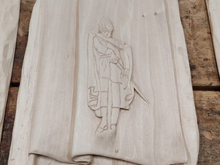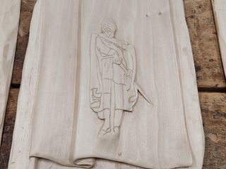 Nella parte superiore, un armadio a due ante che si apre come un abbraccio, conducendo a una lunetta scolpita a mano raffigurante lo skyline del Sacro Monte. All’interno, le ante ospitano formelle in rilievo che narrano i momenti più importanti della storia cittadina.