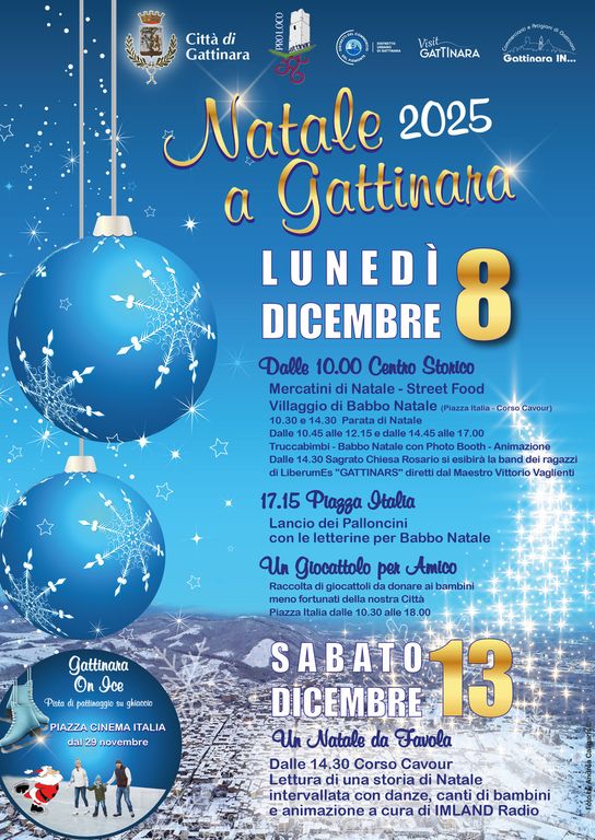 L’atmosfera natalizia avrà un’anteprima speciale: da sabato 29 novembre, in Piazza Cinema Italia, sarà inaugurata la pista di pattinaggio su ghiaccio “Gattinara On Ice”, attrazione che accompagnerà grandi e piccoli per tutte le festività.