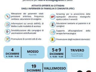 Nell’ambito del Progetto Camper “Cure primarie e territorio: l’Infermiere di Famiglia e Comunità (IFeC) e la medicina di prossimità nell’ASL di Biella”, i giorni 4, 5, 9 e 19 dicembre, dalle 10 alle 16, nelle municipalità di Mosso, Trivero e Valle Mosso, a Valdilana, secondo la calendarizzazione allegata, sarà presente un camper attrezzato che porterà i servizi sanitari direttamente nelle comunità.