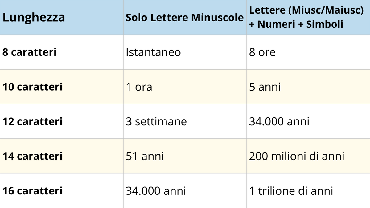C'è poi il tema della complessità. Per essere sicura, una password deve rispettare criteri che la rendano quasi impossibile da indovinare. Ecco una tabella che illustra quanto tempo impiegherebbe un computer a forzare la vostra sicurezza: