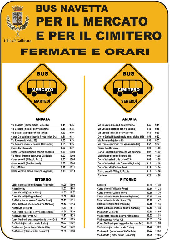 • Martedì (mercato settimanale): corse alle 8.45 e 9.45; ritorno alle 11.00 e 12.00. Il percorso attraverserà Via Cossato, Via Santhià, Corso Garibaldi, Via Rovasenda, Piazza San Bernardo, Corso Vercelli e Corso Valsesia, fino all’area dell’Enoteca Regionale, garantendo un accesso semplice al centro e alle bancarelle.