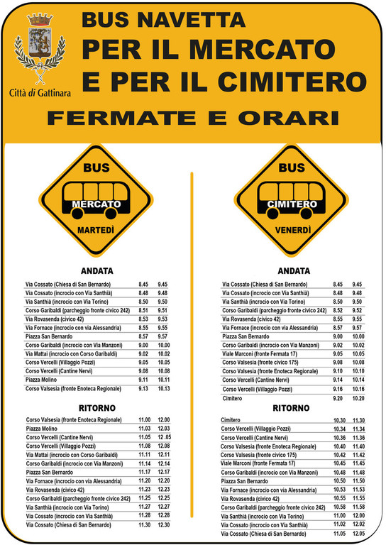 Martedì (mercato settimanale): corse alle 8.45 e 9.45; ritorno alle 11.00 e 12.00. Il percorso attraverserà Via Cossato, Via Santhià, Corso Garibaldi, Via Rovasenda, Piazza San Bernardo, Corso Vercelli e Corso Valsesia, fino all’area dell’Enoteca Regionale, garantendo un accesso semplice al centro e alle bancarelle.