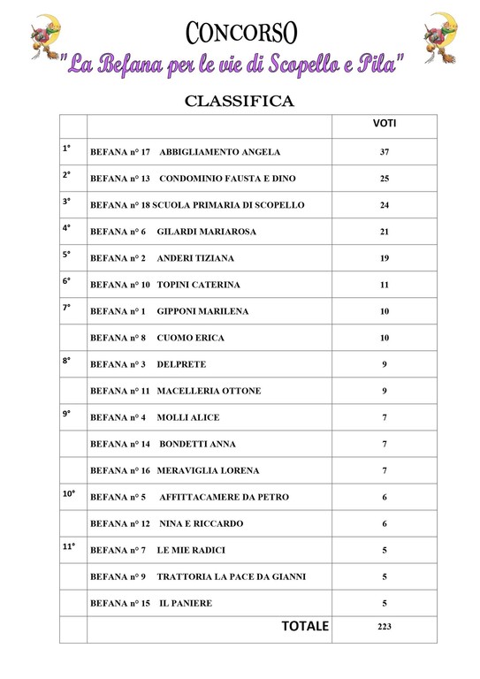 Il titolo di “Befana” più apprezzata è andato alla Befana n° 17 – Abbigliamento Angela, che ha raccolto 37 voti.