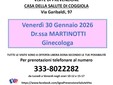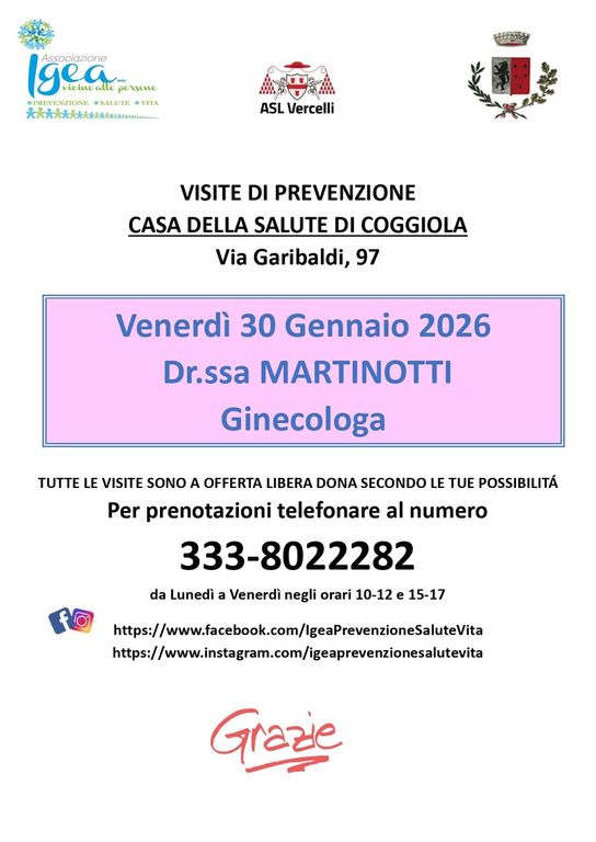 Coggiola: venerdì 30 gennaio 2026, presso la Casa della Salute di Coggiola ( via Garibaldi 97 ) – visite ginecologiche con la dr.ssa Martinotti (in collaborazione con il sistema sanitario locale).