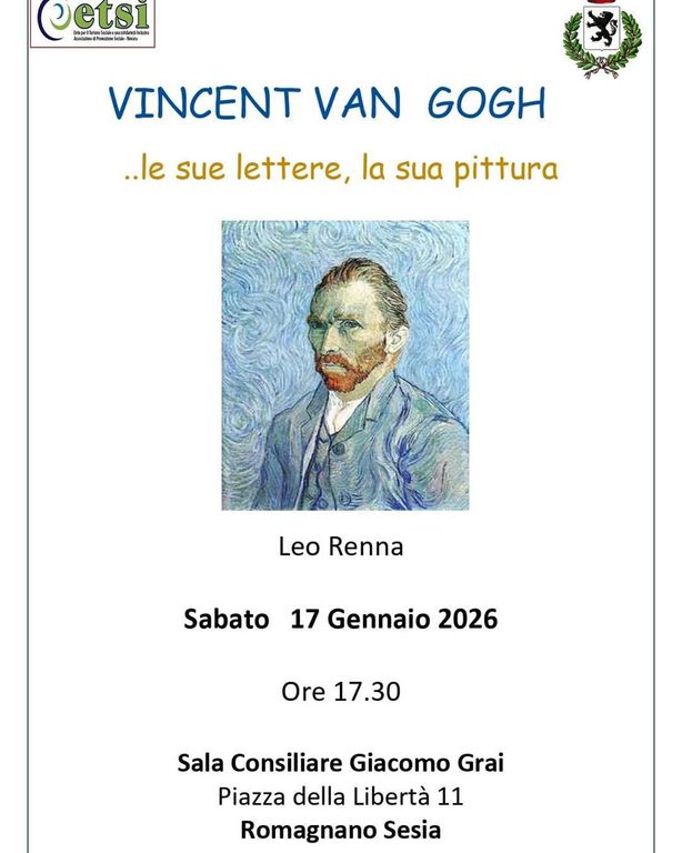 L’iniziativa si terrà alle ore 17.30 nella Sala Consiliare “Giacomo Grai”, in Piazza della Libertà 11, presso il Comune di Romagnano Sesia. A guidare il percorso sarà Leo Renna, che accompagnerà i presenti in un viaggio tra le lettere dell’artista e la sua produzione pittorica, per leggere Van Gogh attraverso i suoi pensieri, le sue fragilità e la straordinaria forza dei suoi colori.