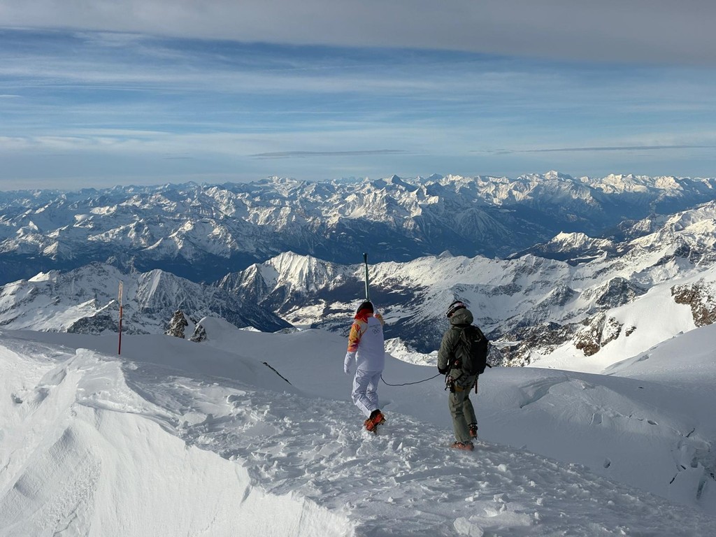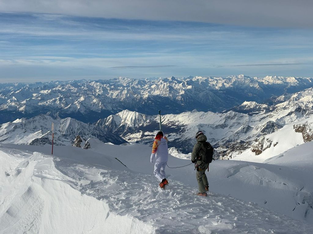 L’accensione si è svolta alle 9.30, in un contesto spettacolare e impegnativo, tra ghiacciai e creste d’alta quota. A portare la fiaccola in vetta sono state le Guide Alpine del Monte Rosa, in una salita iniziata alle prime luci del giorno e proseguita fino alla Capanna Margherita, per poi affrontare il tratto sulla Punta Parrot e la discesa lungo il ghiacciaio del Lys verso il Passo dei Salati.