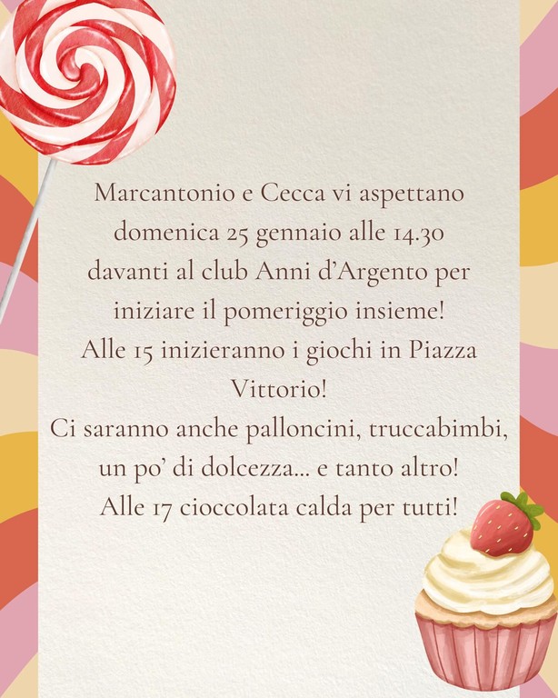Dalle 15.00 ci si sposterà poi in Piazza Vittorio, dove prenderanno il via i giochi per tutti, con un pomeriggio ricco di attività e piccoli momenti di festa.