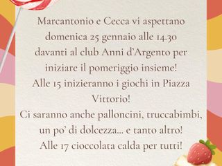 Non mancheranno anche palloncini, truccabimbi e un po’ di dolcezza, mentre alle 17.00 sarà offerta a tutti una cioccolata calda, per chiudere l’iniziativa con un tocco davvero goloso.