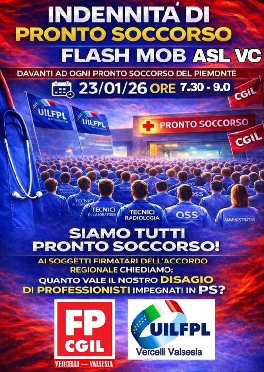 Flash mob anche a Vercelli nella mattinata di venerdì 23 gennaio 2026, in linea con iniziative analoghe promosse davanti ai Pronto soccorso delle aziende sanitarie pubbliche del Piemonte. A organizzarlo sono stati FP CGIL e UIL FPL, per contestare l’accordo regionale sulla distribuzione dell’indennità di pronto soccorso, sottoscritto – secondo quanto riportato nel comunicato – con Cisl Fp, Nursind, Nursing Up e Fials Piemonte.