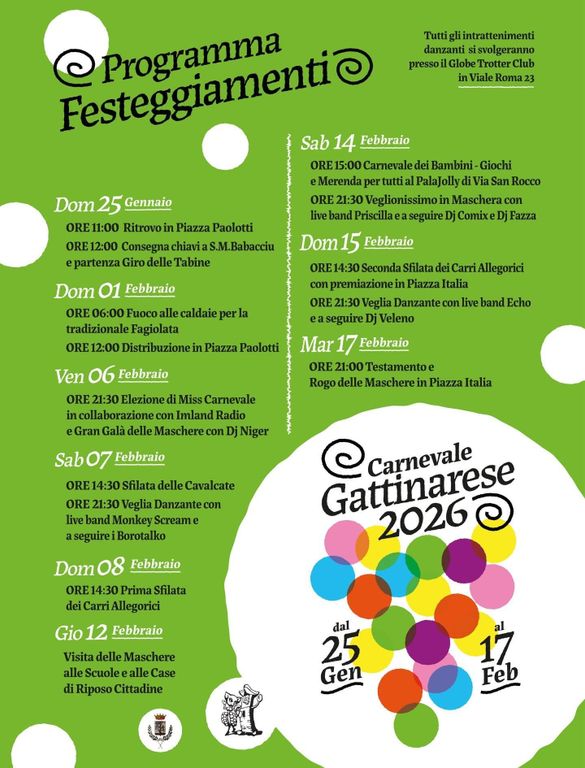 La chiusura sarà affidata alla serata più simbolica: martedì 17 febbraio alle 21.00, in Piazza Italia, si terranno il Testamento e il Rogo delle Maschere, rito che conclude il Carnevale e saluta l’inverno con lo spirito tipico della tradizione gattinarese.