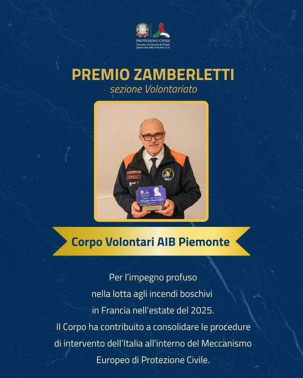 Nella motivazione è riportato: «Per l’impegno profuso nella lotta agli incendi boschivi in Francia nell’estate 2025. Il Corpo ha contribuito a consolidare le procedure di intervento dell’Italia all’interno del Meccanismo Europeo di Protezione Civile». Il premio valorizza così l’impegno quotidiano del Corpo AIB Piemonte, punto di riferimento essenziale del sistema regionale di Protezione civile, protagonista nelle attività di prevenzione e contrasto degli incendi boschivi e negli interventi legati alle principali emergenze che hanno colpito il territorio negli ultimi anni.