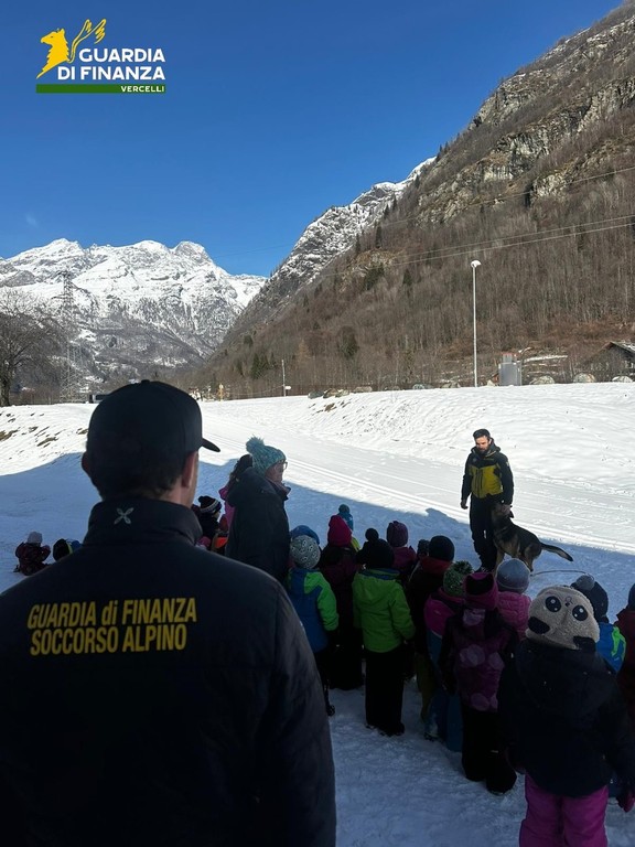 Nei giorni scorsi i militari della Stazione di Soccorso Alpino della Guardia di Finanza di Alagna Valsesia (VC) hanno incontrato gli alunni delle scuole primarie di Quarona, Scopello e Varallo spiegando in modo semplice le attività che quotidianamente svolgono in montagna in soccorso delle persone e coinvolgendo i giovani cittadini con l’aiuto di Kurz, uno dei tre cani da ricerca dei finanzieri vercellesi.