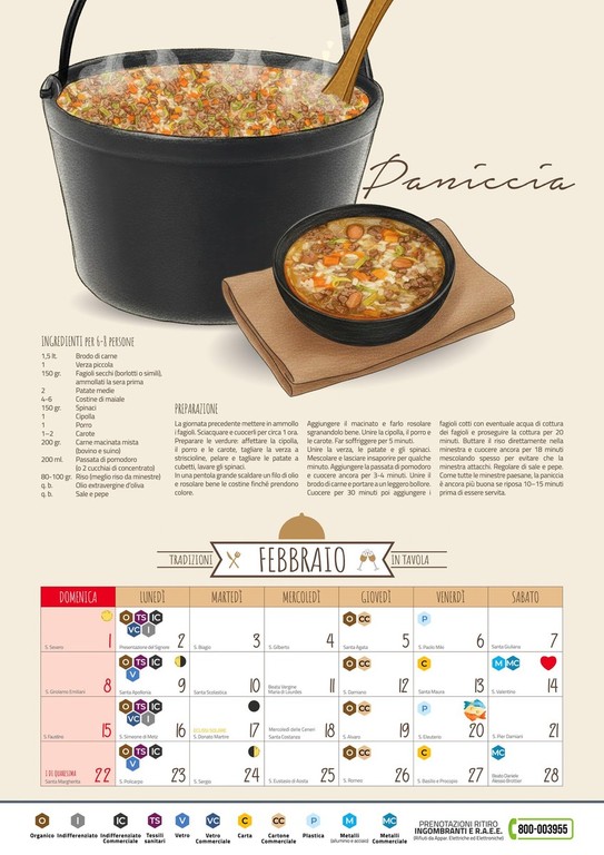 Quando l’inverno in Valsesia entra nel suo cuore più vero, servono piatti capaci di fare una cosa sola, ma benissimo: scaldare. E per febbraio il calendario 2026 della raccolta differenziata della Città di Varallo sceglie la paniccia, una minestra sostanziosa e “di casa”, di quelle che si mettono sul fuoco con calma e poi si condividono volentieri, magari dopo una giornata all’aria fredda.
