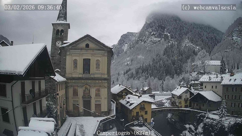 Salendo ancora, a Campertogno (circa 830 metri) la neve è più presente e compatta: si distinguono bene carreggiate, tetti e sponde del fiume con copertura più uniforme.