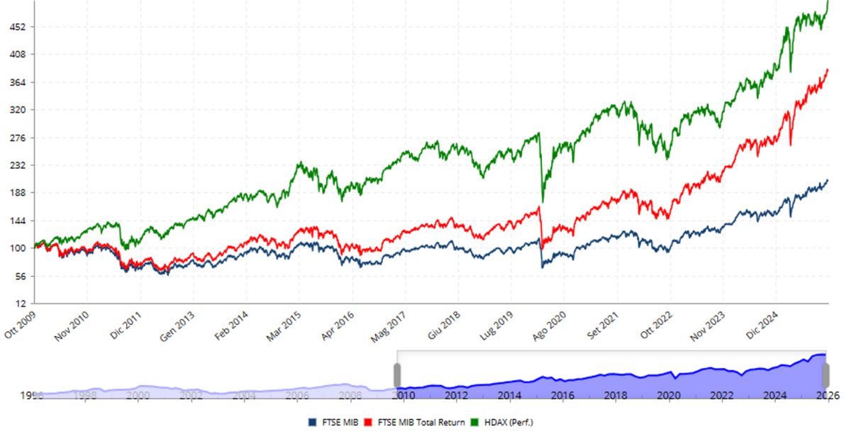 Se il FTSE MIB fosse calcolato come total return, cioè includendo i dividendi reinvestiti, il valore storico sarebbe stato recuperato molto prima, a fine 2021, riducendo la sensazione di “attesa lunga quasi 20 anni”.