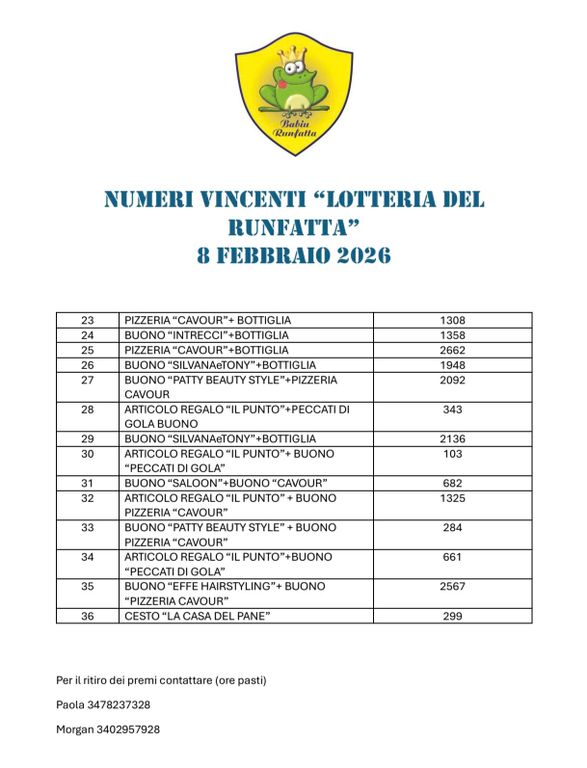 Per il ritiro dei premi (ore pasti) i contatti indicati sono: Paola 347 8237328 e Morgan 340 2957928.