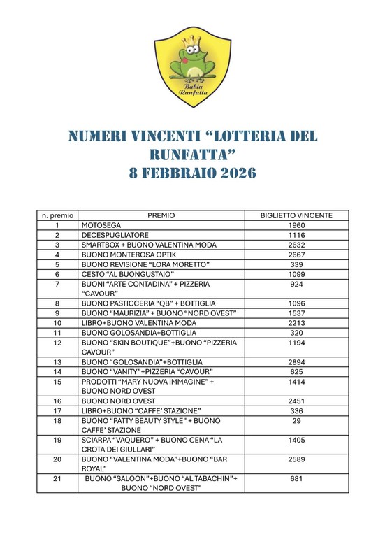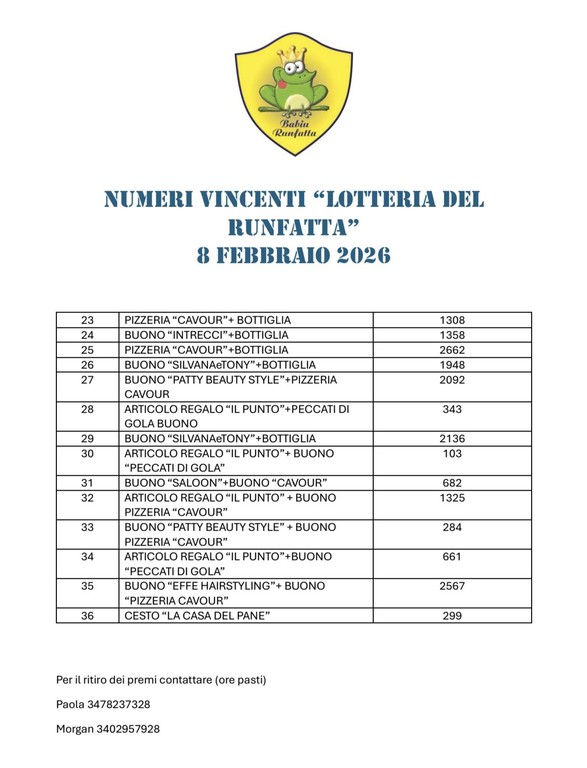 Sono stati resi noti i numeri vincenti della Lotteria del Runfatta, estratti l’8 febbraio 2026. Di seguito l’elenco dei premi abbinati ai rispettivi biglietti.
