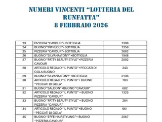 Sono stati resi noti i numeri vincenti della Lotteria del Runfatta, estratti l’8 febbraio 2026. Di seguito l’elenco dei premi abbinati ai rispettivi biglietti.