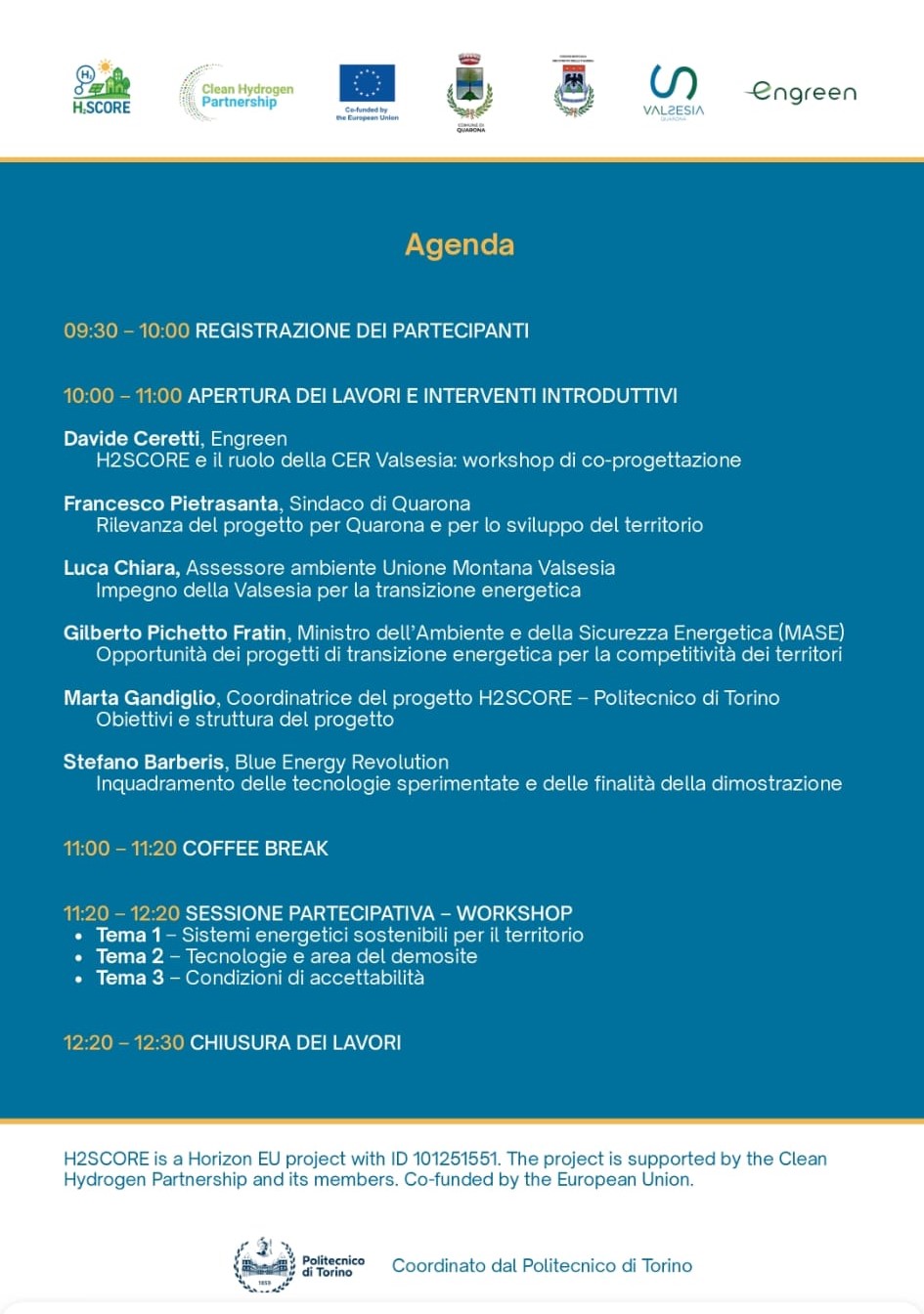 Dopo la registrazione (9.30-10.00), alle 10.00 è prevista l’apertura dei lavori con gli interventi introduttivi. Tra i relatori attesi anche il ministro Gilberto Pichetto Fratin, con un contributo dedicato alle opportunità dei progetti di transizione energetica per la competitività dei territori. Al tavolo anche il sindaco di Quarona e presidente dell’Unione Montana Valsesia Francesco Pietrasanta, l’assessore all’Ambiente dell’Unione Montana Luca Chiara, la coordinatrice del progetto Marta Gandiglio del Politecnico di Torino, oltre a Davide Ceretti e Stefano Barberis di Blue Energy Revolution.