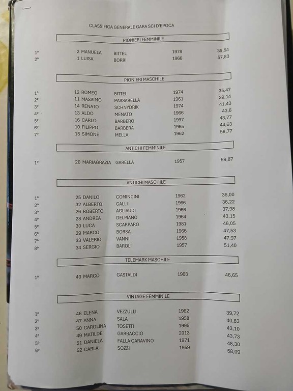 Complice la bella giornata di sole, ben 71 sportivi hanno preso parte alla rievocazione, arrivando da molte regioni d'Italia, come Liguria, Lombardia, Marche, Toscana, Trentino e Veneto, oltre dalla vicina Svizzera (con 4 rappresentanti). La gara, inoltre, ha visto come ospite d'onore Piero Gros, oro olimpico nello slalom, omaggiato per l'occasione con una targa realizzata dall'artista (e sciatore) biellese Paolo Barichello. 5 le categorie presenti, con una grande novità: il monosci, molto in voga negli anni ’80.