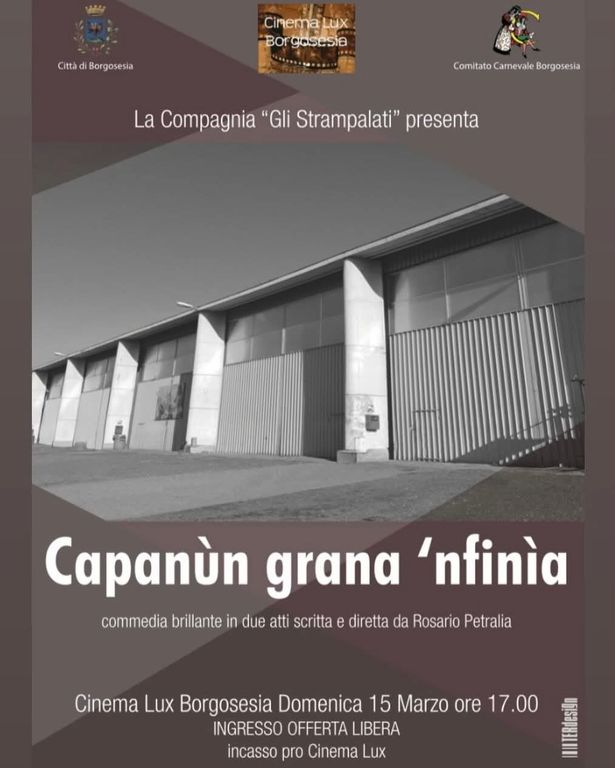 A Borgosesia, in Valsesia, la domenica di metà marzo porta sul palco una serata di teatro popolare e risate, con un obiettivo anche concreto: sostenere il Cinema Lux. Domenica 15 marzo, alle 17.00, al Cinema Lux Borgosesia la compagnia “Gli Strampalati” presenta “Capanùn grana ’nfinìa”, commedia brillante in due atti scritta e diretta da Rosario Petralia.