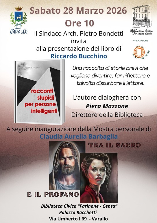 A Varallo la Biblioteca Civica “Farinone-Centa” si prepara ad accogliere una mattinata che unisce scrittura, dialogo culturale e arti visive. Sabato 28 marzo a Palazzo Racchetti, in via Umberto I 69, sono in programma due appuntamenti consecutivi: alle 10 la presentazione del libro “Racconti stupidi per persone intelligenti” di Riccardo Bucchino, seguita alle 11 dall’inaugurazione della mostra personale “Tra il sacro e il profano” di Claudia Aurelia Barbaglia.