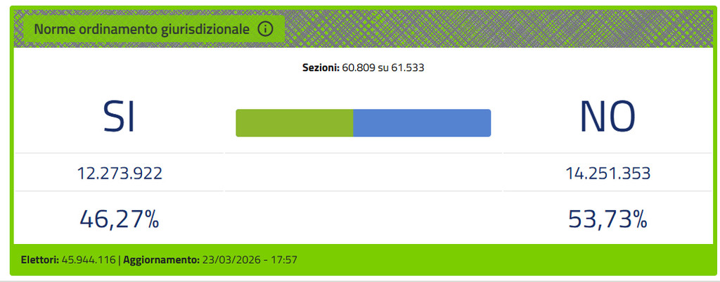 Il “No” prevale nettamente nel referendum sulla riforma della giustizia: con 60.841 sezioni scrutinate su 61.533, si attesta al 53,73%, mentre il “Sì” si ferma al 46,27%, secondo i dati pubblicati sul sito Eligendo del Viminale.