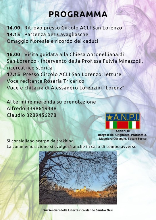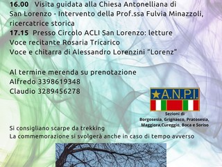 Sono in calendario la partenza per Cavagliasche, l’omaggio floreale ai Caduti, una visita guidata alla Chiesa Antonelliana di San Lorenzo, letture e una merenda finale su prenotazione.
