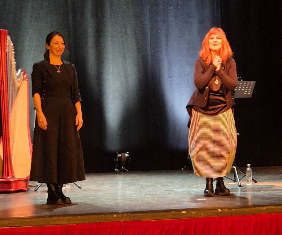 Monica Micheli all’arpa non offre solo musica cristallina, ma diventa la silenziosa interlocutrice della Massironi.