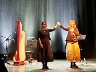 Monica Micheli all’arpa non offre solo musica cristallina, ma diventa la silenziosa interlocutrice della Massironi.