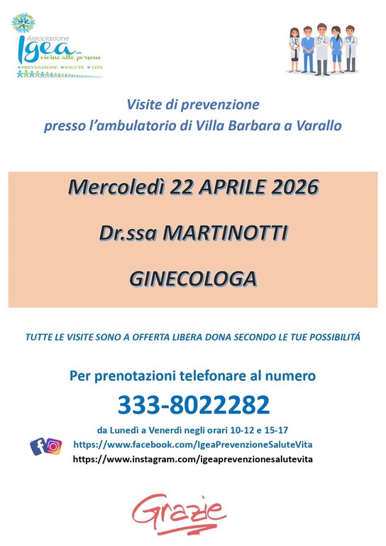 Il primo è in calendario per sabato 18 aprile 2026 con il Dottor Coppo, specialista Angiologo. Il secondo si terrà invece mercoledì 22 aprile 2026 con la Dottoressa Martinotti, specialista Ginecologa.