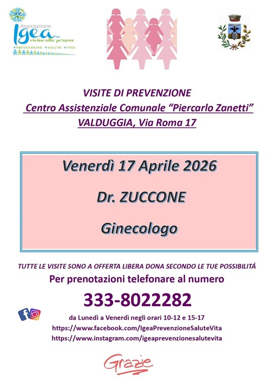 Il primo appuntamento in ordine di tempo sarà però a Valduggia, dove venerdì 17 aprile 2026 è in programma una visita di prevenzione con il Dottor Zuccone, Ginecologo.