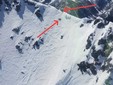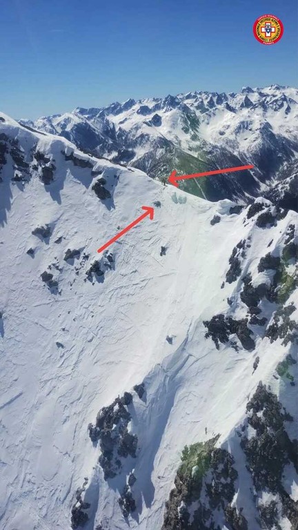 Dal Nord-ovest, infortunio in alta quota: salvato scialpinista infortunato (freccia in alto - posizione del soccorritore; freccia in basso - posizione dello scialpinista)