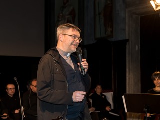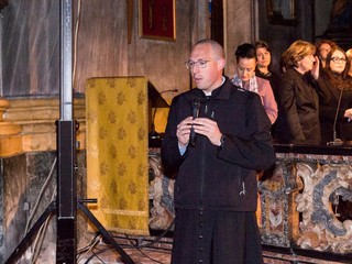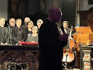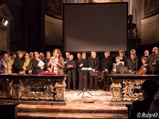 L’apertura musicale ha subito definito il tono dell’iniziativa. Nel buio della navata centrale i Cantores Mundi hanno proposto la deploration Mors tu as navré – Miserere di J. Ockeghem, per poi salire all’altare con il canto processionale Vexilla Regis – Passio Domini di Pierre de la Rue. Una scelta che ha trasformato la chiesa in uno spazio di raccoglimento e ascolto, in sintonia con la figura ricordata.