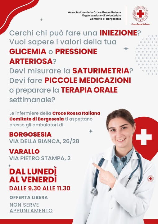 A Borgosesia e Varallo è attivo un servizio infermieristico della Croce Rossa Italiana – Comitato di Borgosesia pensato per offrire un supporto semplice e accessibile nella gestione di alcune necessità sanitarie quotidiane. Il servizio è disponibile dal lunedì al venerdì, in accesso libero e senza appuntamento.