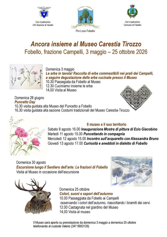 A Fobello, in frazione Campelli, si prepara una nuova stagione di iniziative attorno al Museo Carestia Tirozzo, con un programma che accompagnerà il pubblico dal 3 maggio al 25 ottobre 2026. Il calendario, intitolato “Ancora insieme al Museo Carestia Tirozzo”, mette insieme passeggiate, visite guidate, appuntamenti legati alle tradizioni locali, arte e momenti dedicati alla natura.