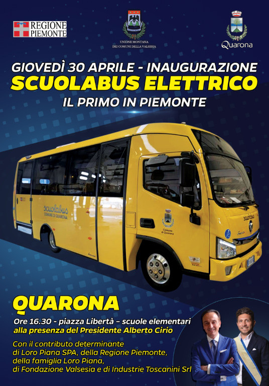 A Quarona il prossimo 30 aprile sarà inaugurato quello che viene presentato come il primo scuolabus elettrico del Piemonte, un mezzo destinato a segnare un passaggio importante per il trasporto scolastico locale e, più in generale, per il percorso di transizione energetica avviato in Valsesia. Alla cerimonia, in programma alle 16.30 in piazza Libertà, sarà presente anche il Presidente della Regione Alberto Cirio.