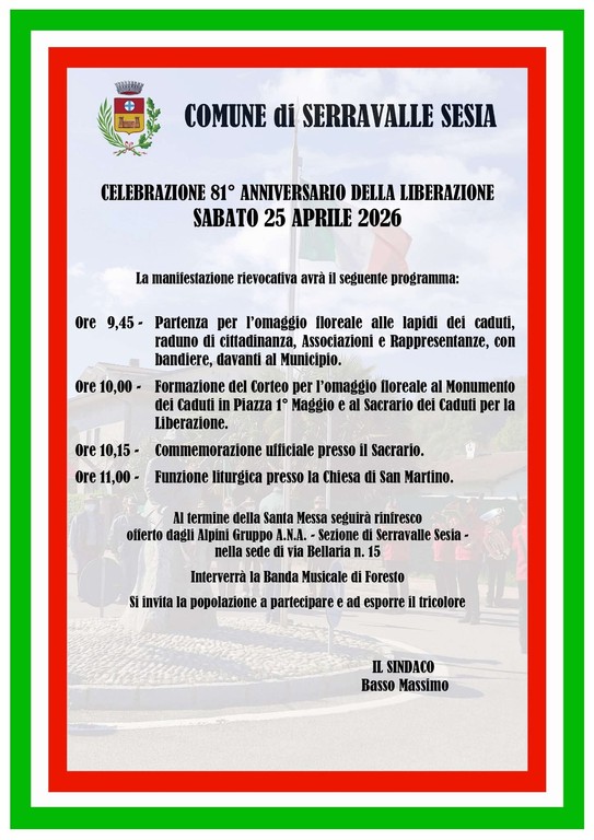 A Serravalle Sesia il 25 Aprile 2026 sarà celebrato con una mattinata dedicata alla memoria della Liberazione, tra omaggi floreali, corteo cittadino, commemorazione ufficiale e momento religioso. Il programma è stato diffuso dal Comune di Serravalle Sesia in occasione dell’81° anniversario della Liberazione.