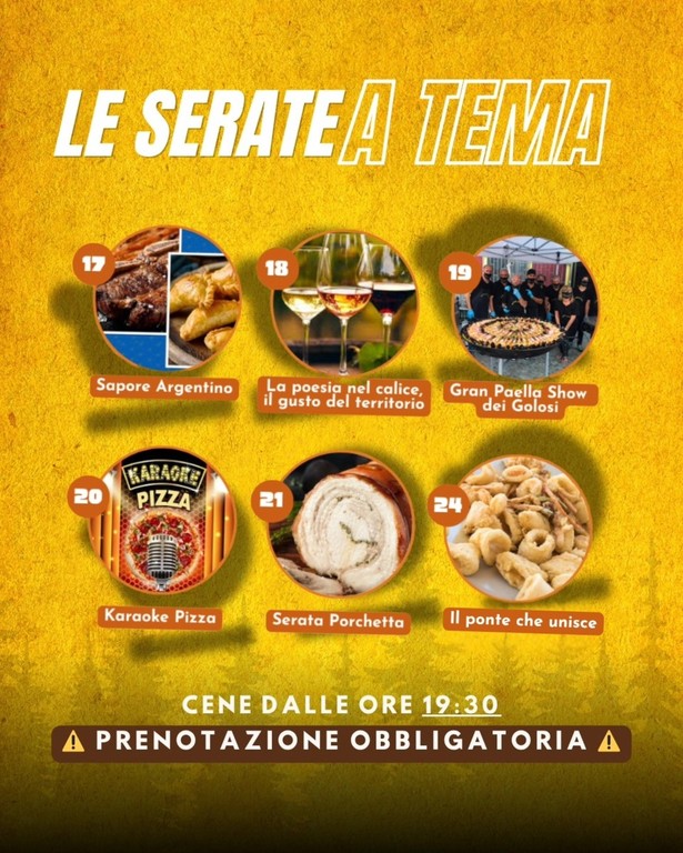 Il programma indicato nelle locandine prevede: Sapore Argentino il 17 maggio, “La poesia nel calice, il gusto del territorio” il 18 maggio, Gran Paella Show dei Golosi il 19 maggio, Karaoke Pizza il 20 maggio, Serata Porchetta il 21 maggio e “Il ponte che unisce” il 24 maggio.