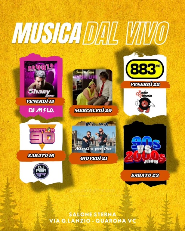 Mercoledì 20 maggio spazio alla musica live con Henry & The Carry. Giovedì 21 maggio toccherà ad Attenti a quel Duo, mentre venerdì 22 maggio sarà protagonista la serata dedicata agli 883, con la presenza di Radio Valsesia.
