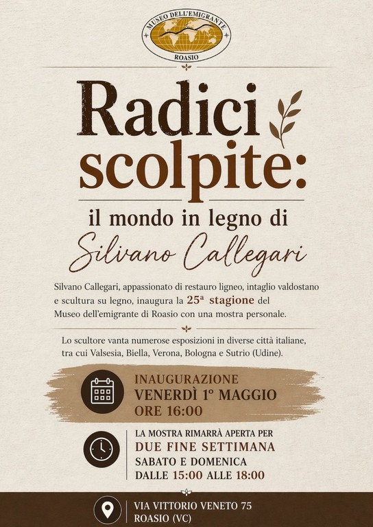 Il Museo dell’Emigrante di Roasio inaugura la sua 25ª stagione con la mostra “Radici scolpite: il mondo in legno di Silvano Callegari”.