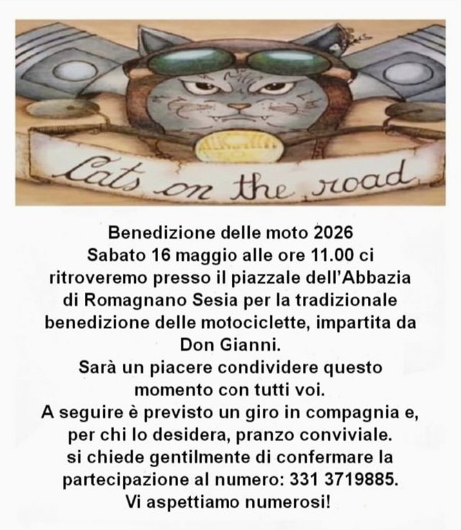 A Romagnano Sesia torna la tradizionale benedizione delle moto. L’appuntamento è in programma sabato 16 maggio 2026 alle 11, con ritrovo nel piazzale dell’Abbazia.