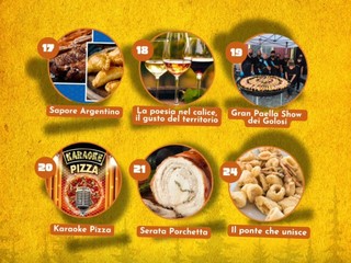 Il programma indicato nelle locandine prevede: Sapore Argentino il 17 maggio, “La poesia nel calice, il gusto del territorio” il 18 maggio, Gran Paella Show dei Golosi il 19 maggio, Karaoke Pizza il 20 maggio, Serata Porchetta il 21 maggio e “Il ponte che unisce” il 24 maggio.